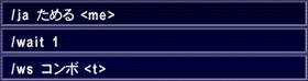「/wait」は,その後に記された秒数だけ待つ,という意味。つまりボタン一発で,「ジョブアビリティの“ためる”を使い,1秒後にウェポンスキルの“コンボ”を使う」というわけだ。シーフの「不意打ち」などにも応用できるだろう。
